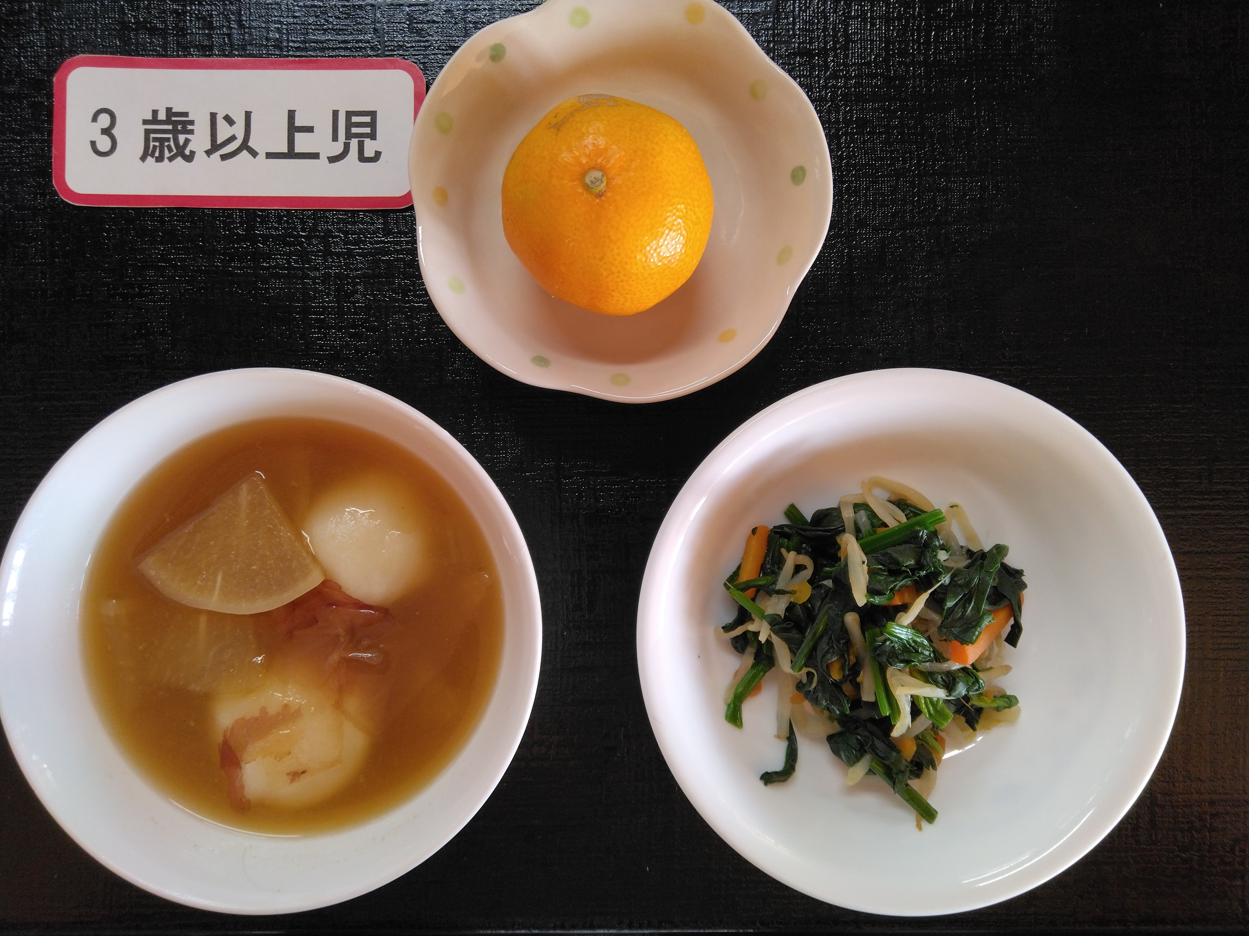 雑煮の中にはらいおんぐみさんが畑でつくった蕪と、丸いもち、かつお節が入っています。