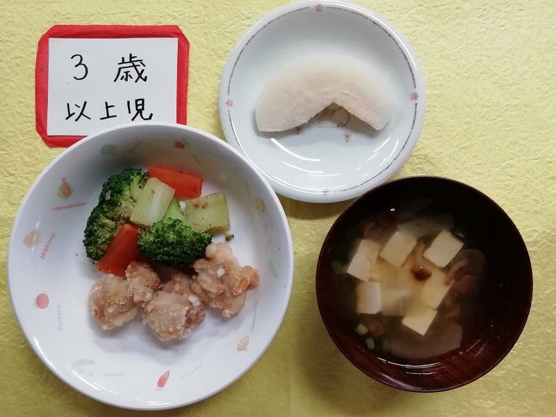 園では油で揚げた高野豆腐と、お肉、野菜を煮込んで醤油で味付けしています。