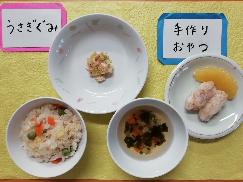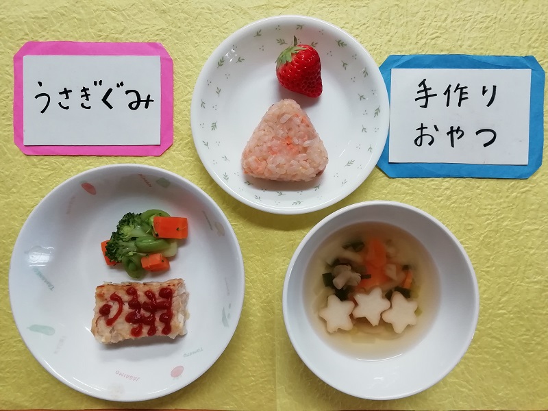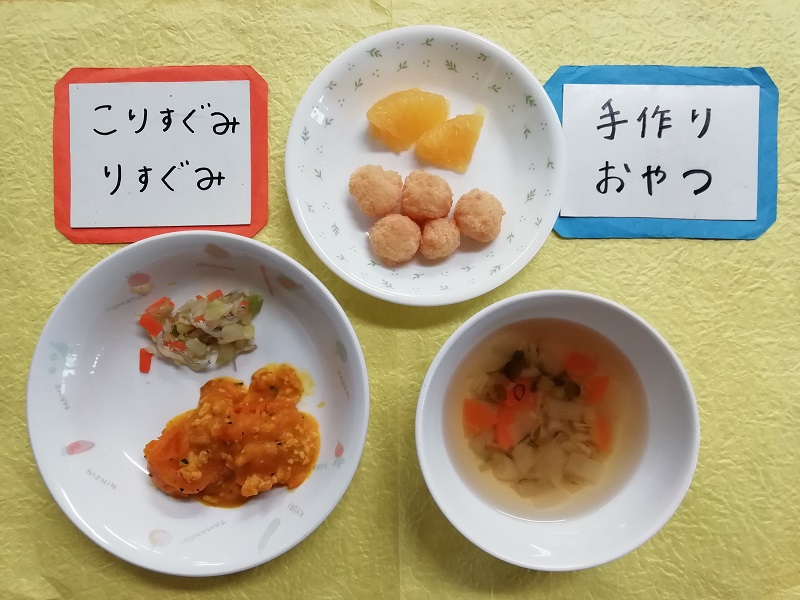※2枚目の画像に「こりすぐみ」の札がありますが、「りす・うさぎぐみ」のおしょくじです。