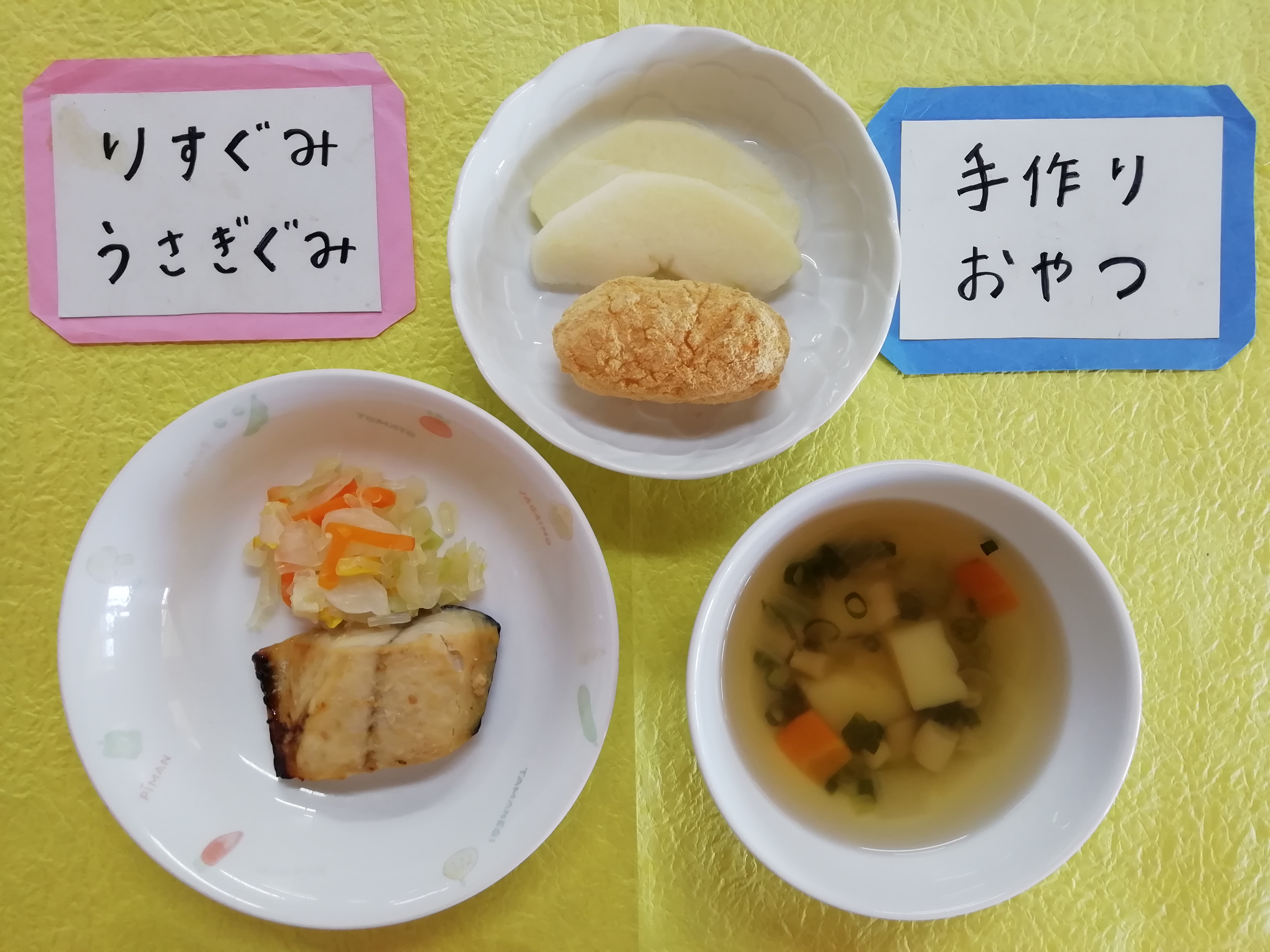 ☆こりすさんのおやつはくだものです。りすさんはくだものとフルーツ寒天を食べました。
