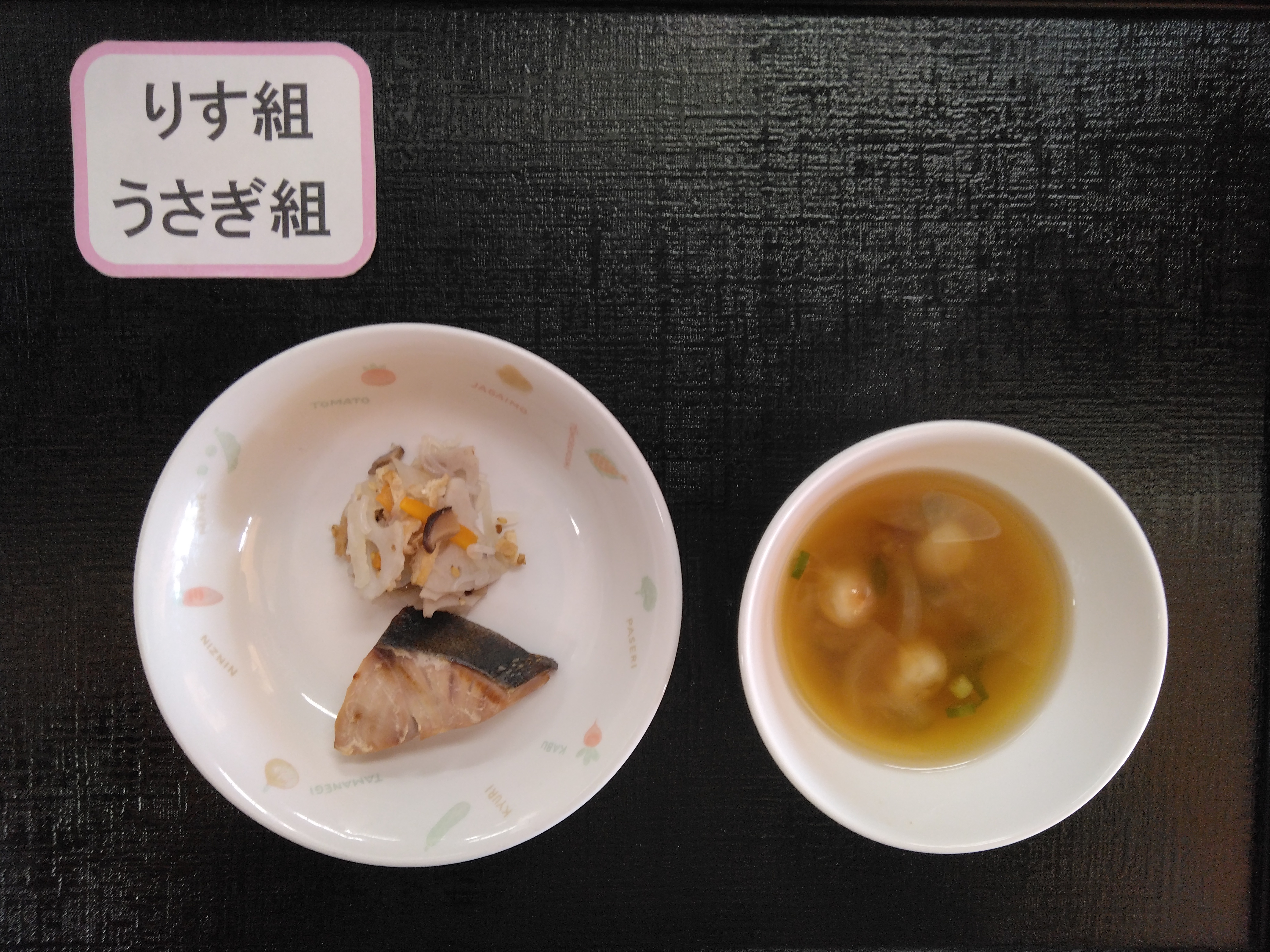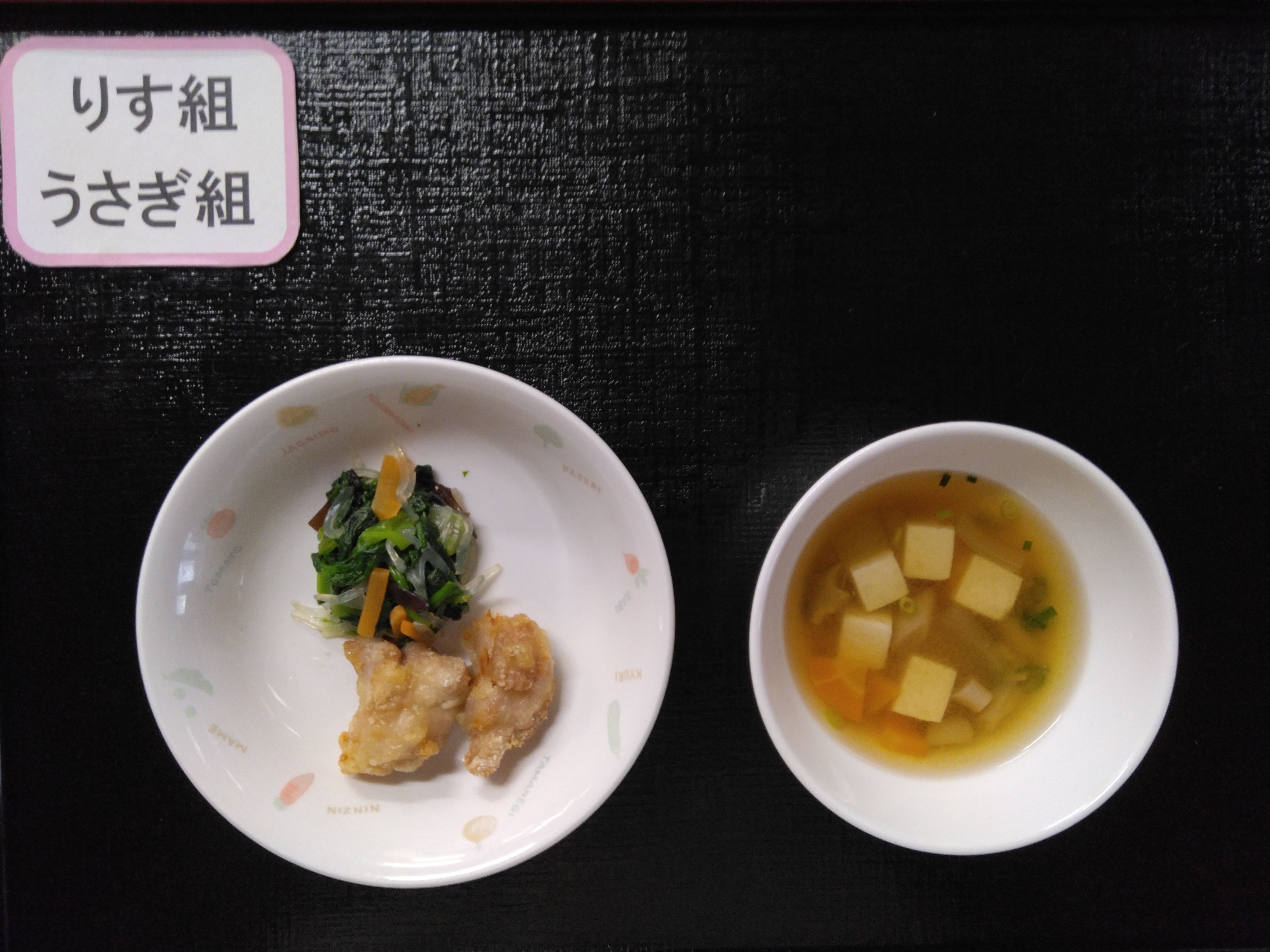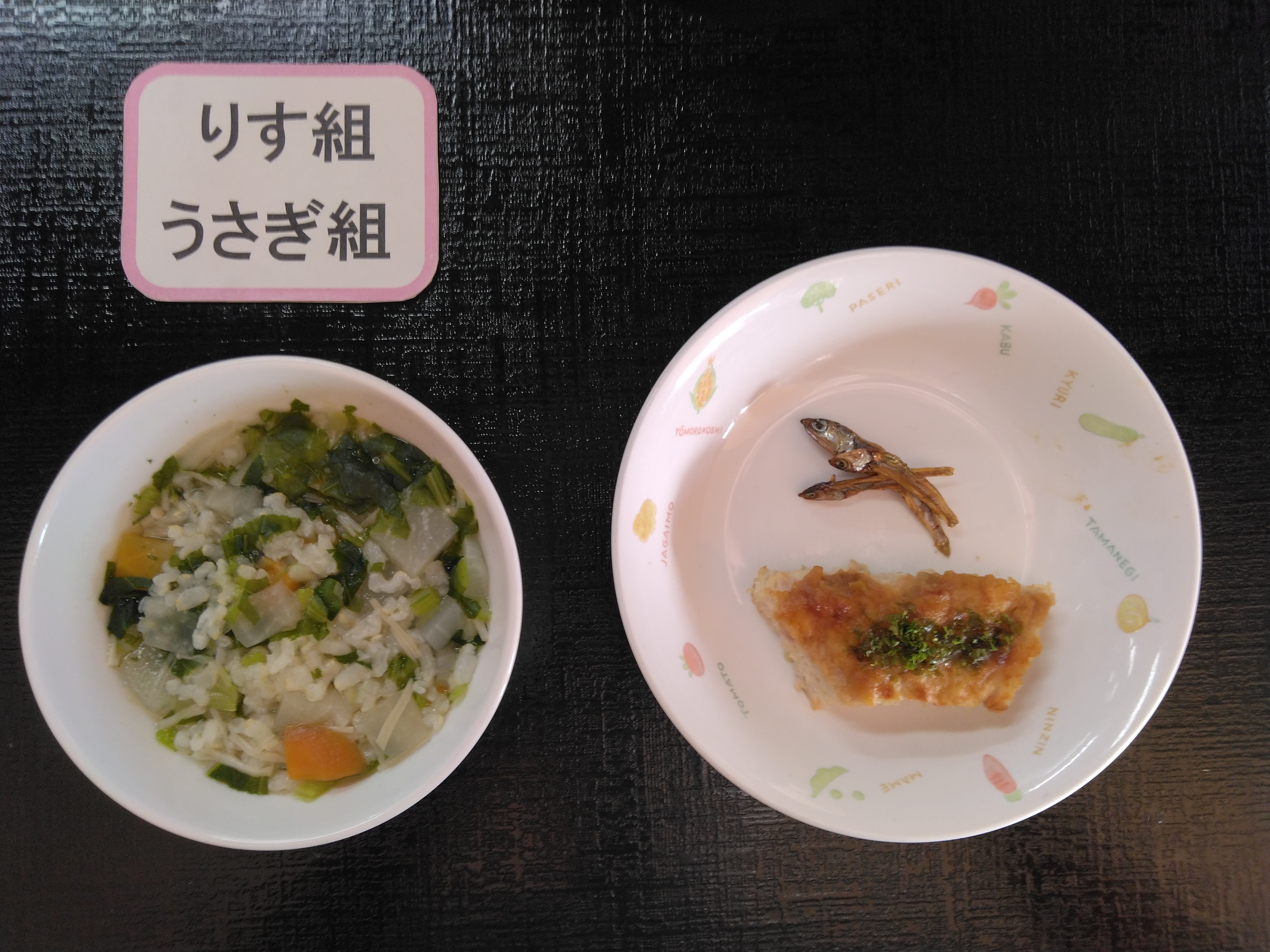 - 今日の煮物の中には、昨日ぞうぐみさんが収穫してきた小松菜と人参が入っています。