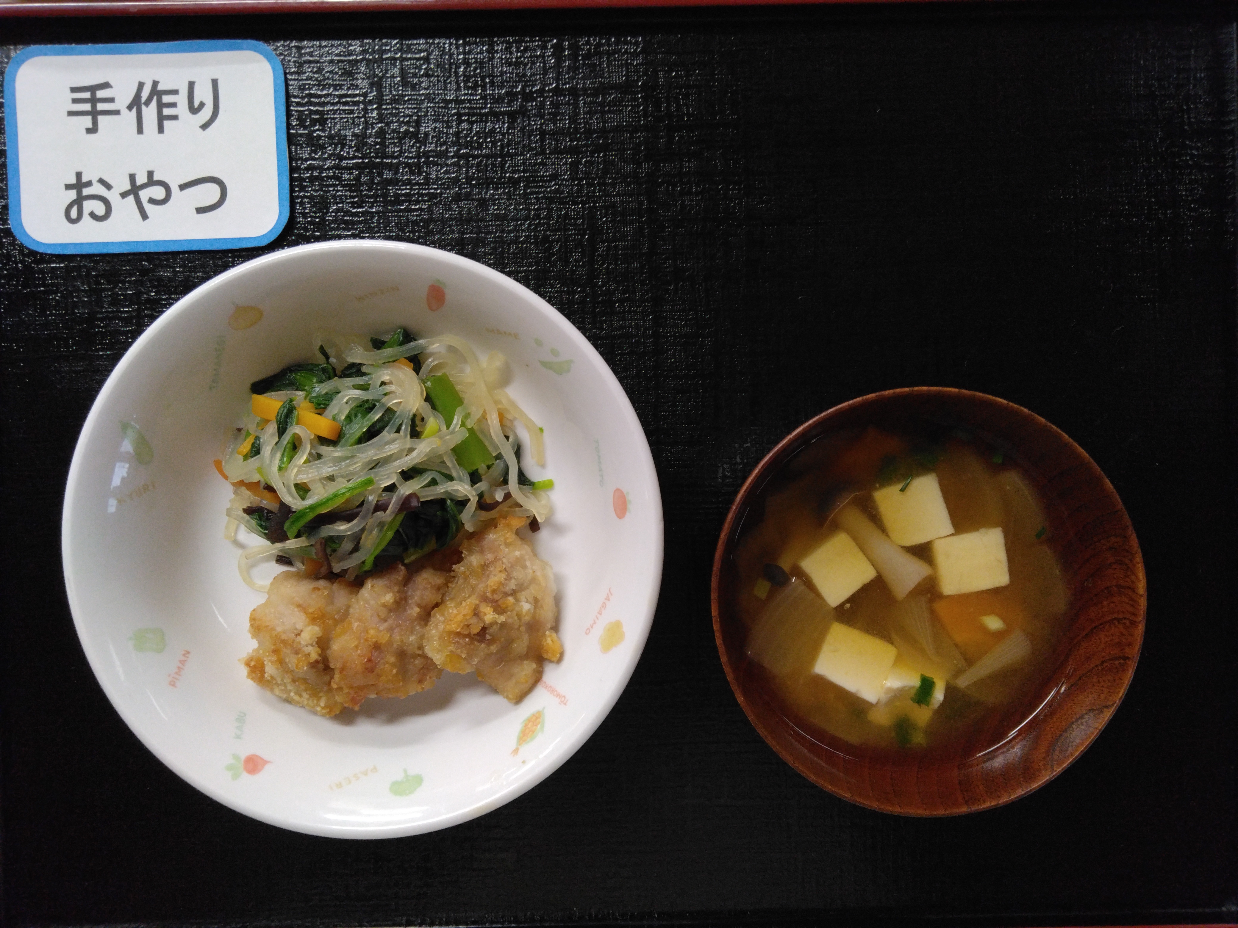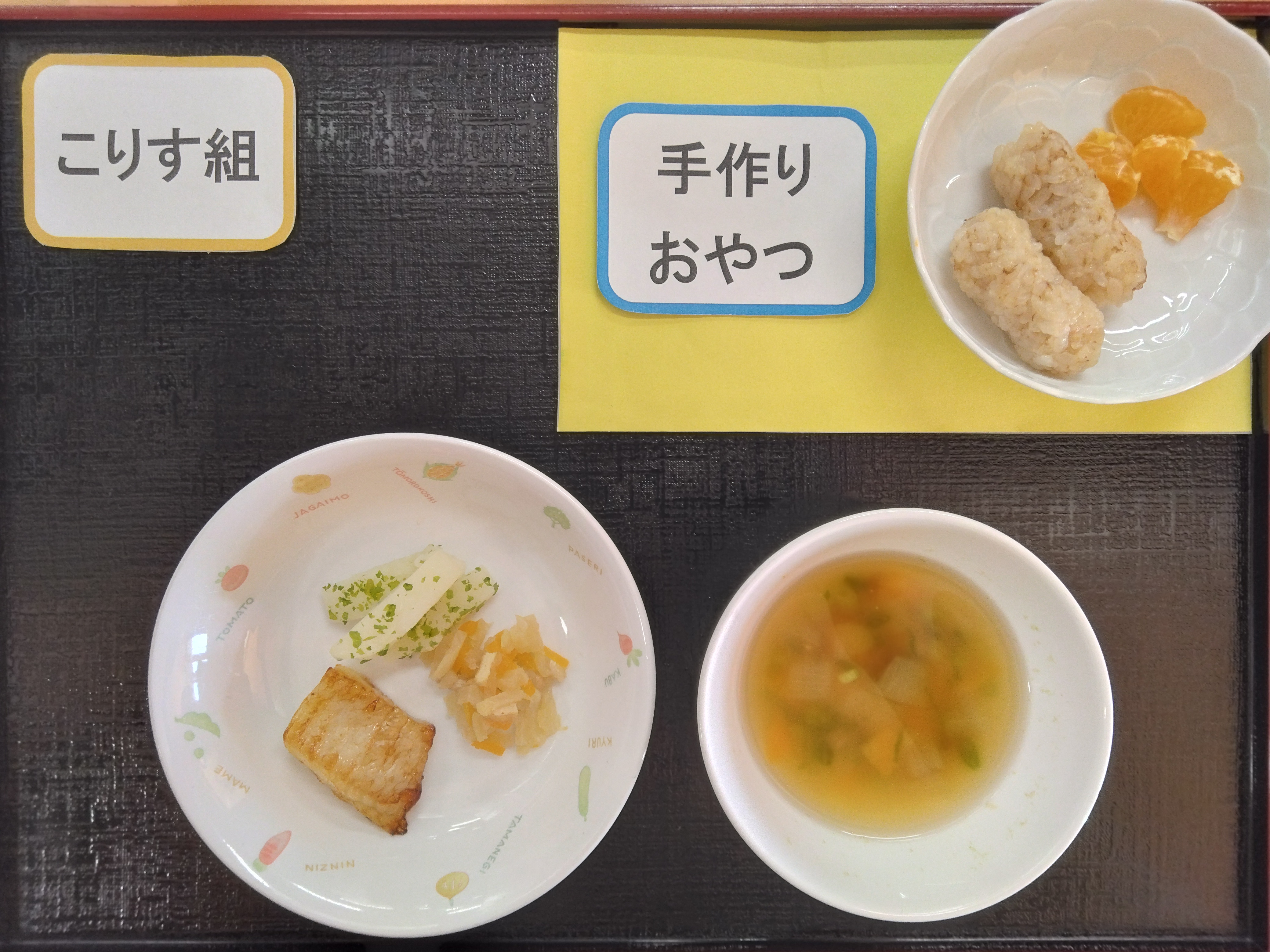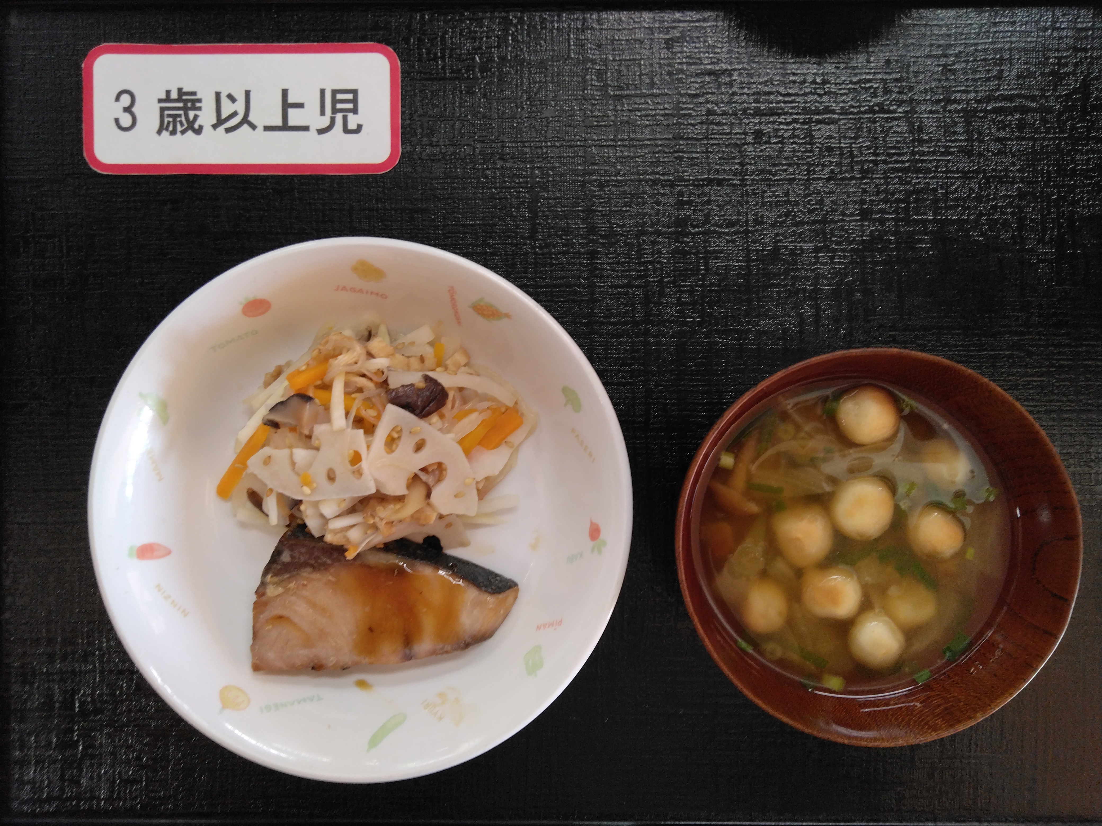 - 今日の煮物の中には、昨日ぞうぐみさんが収穫してきた小松菜と人参が入っています。