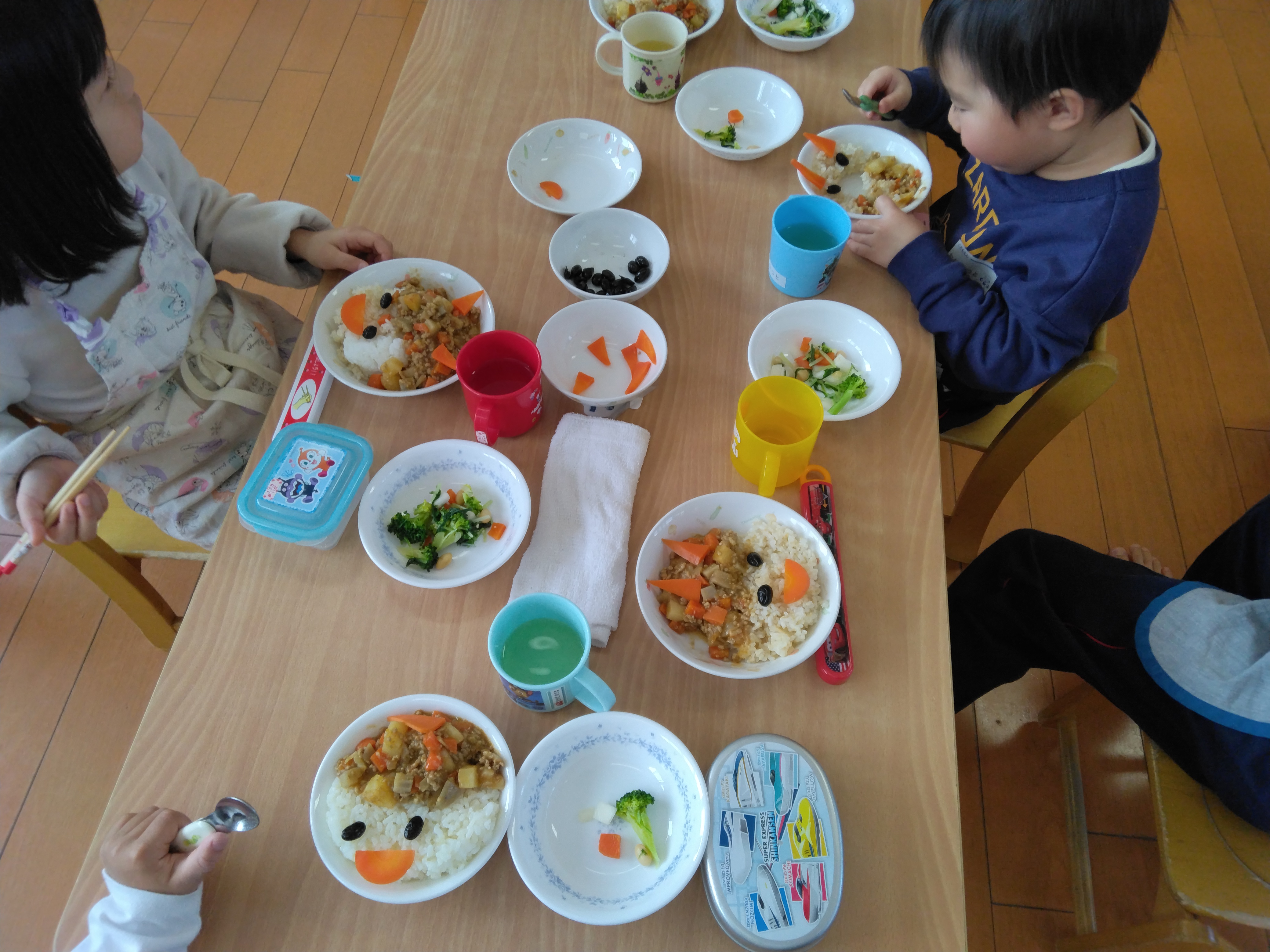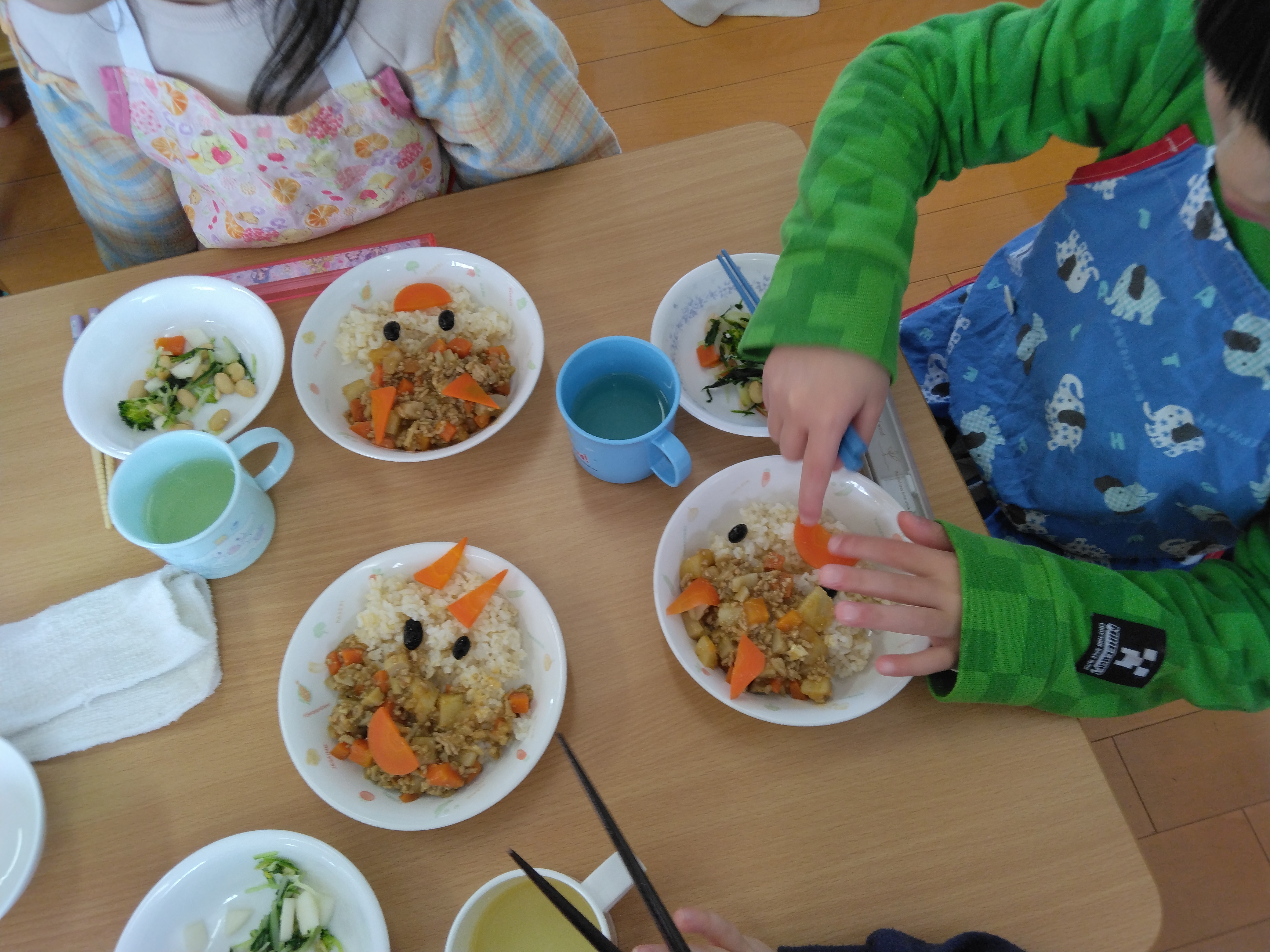 黒豆と人参を使って目と口と角をつけて、自分の鬼さんの顔を完成させてください。