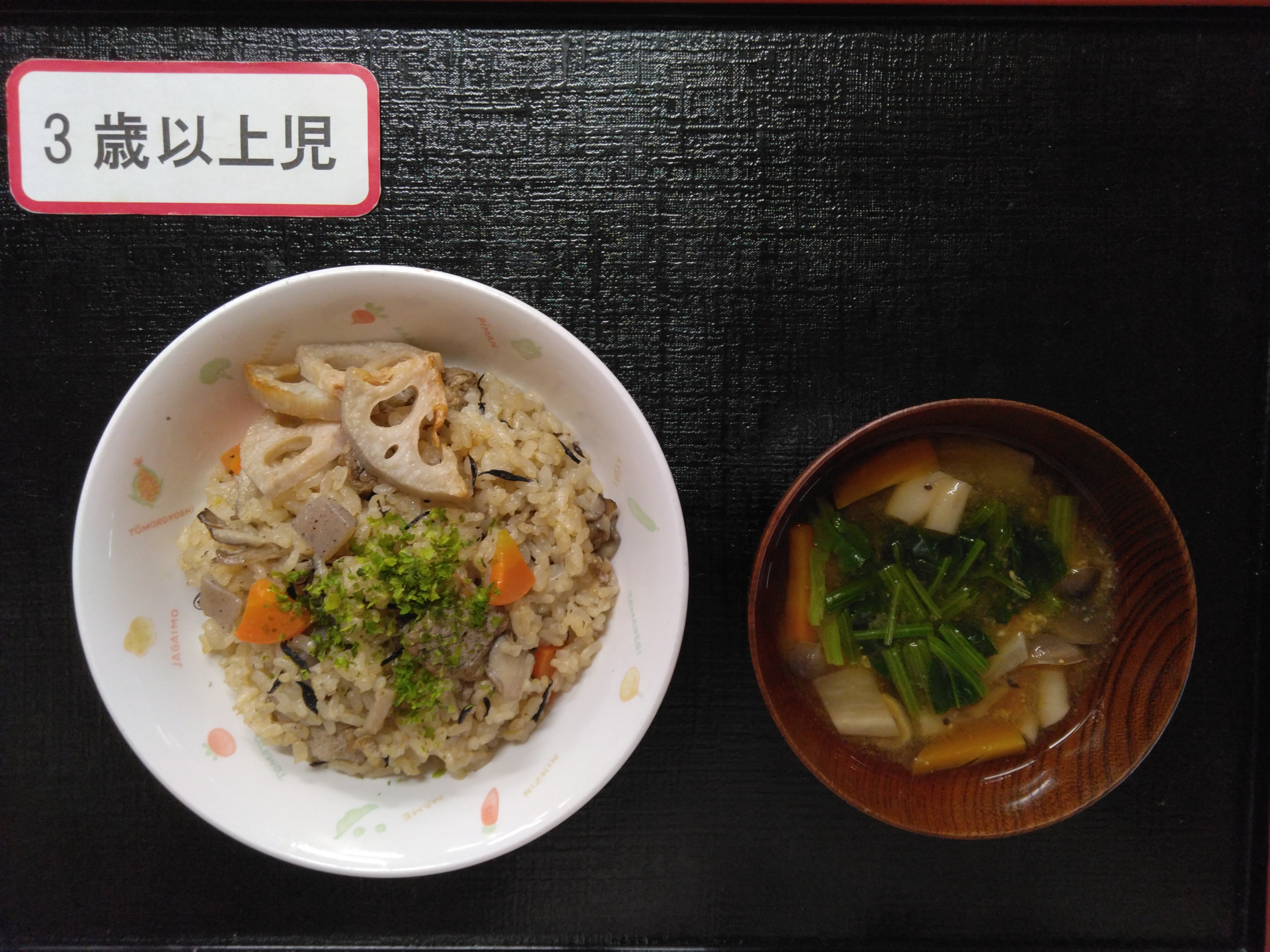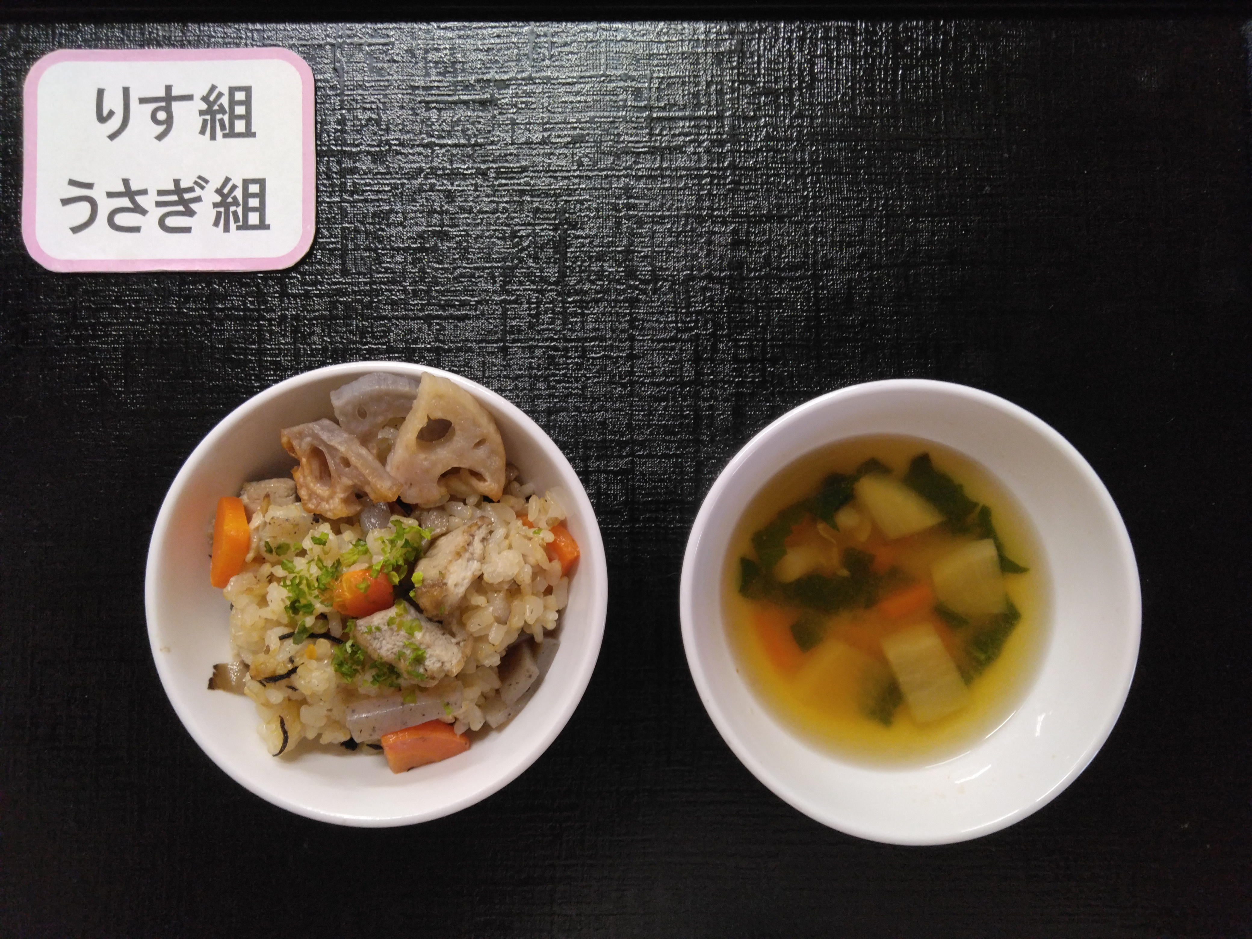 - 今日は蓮根とにんじんのごはんです。