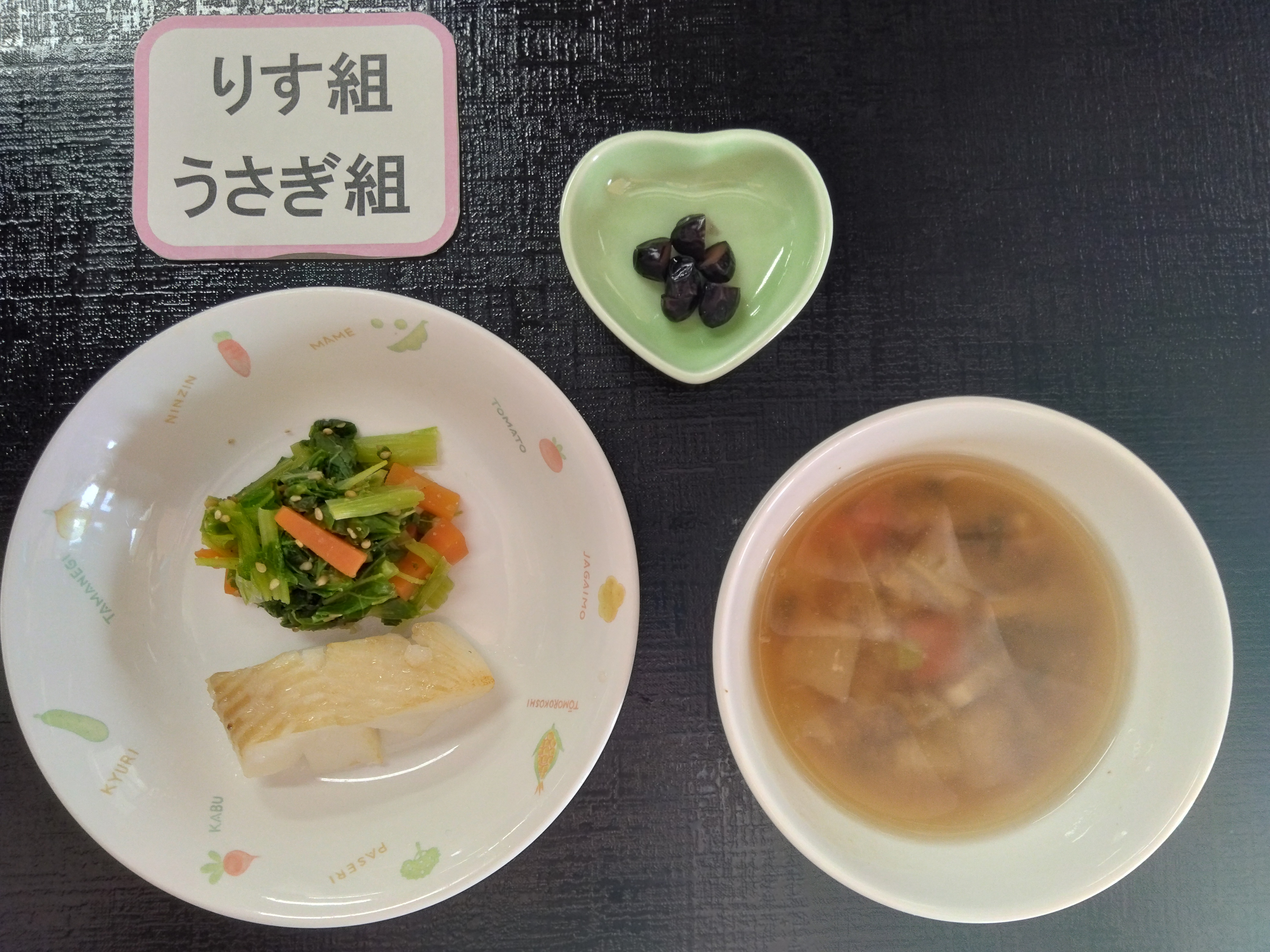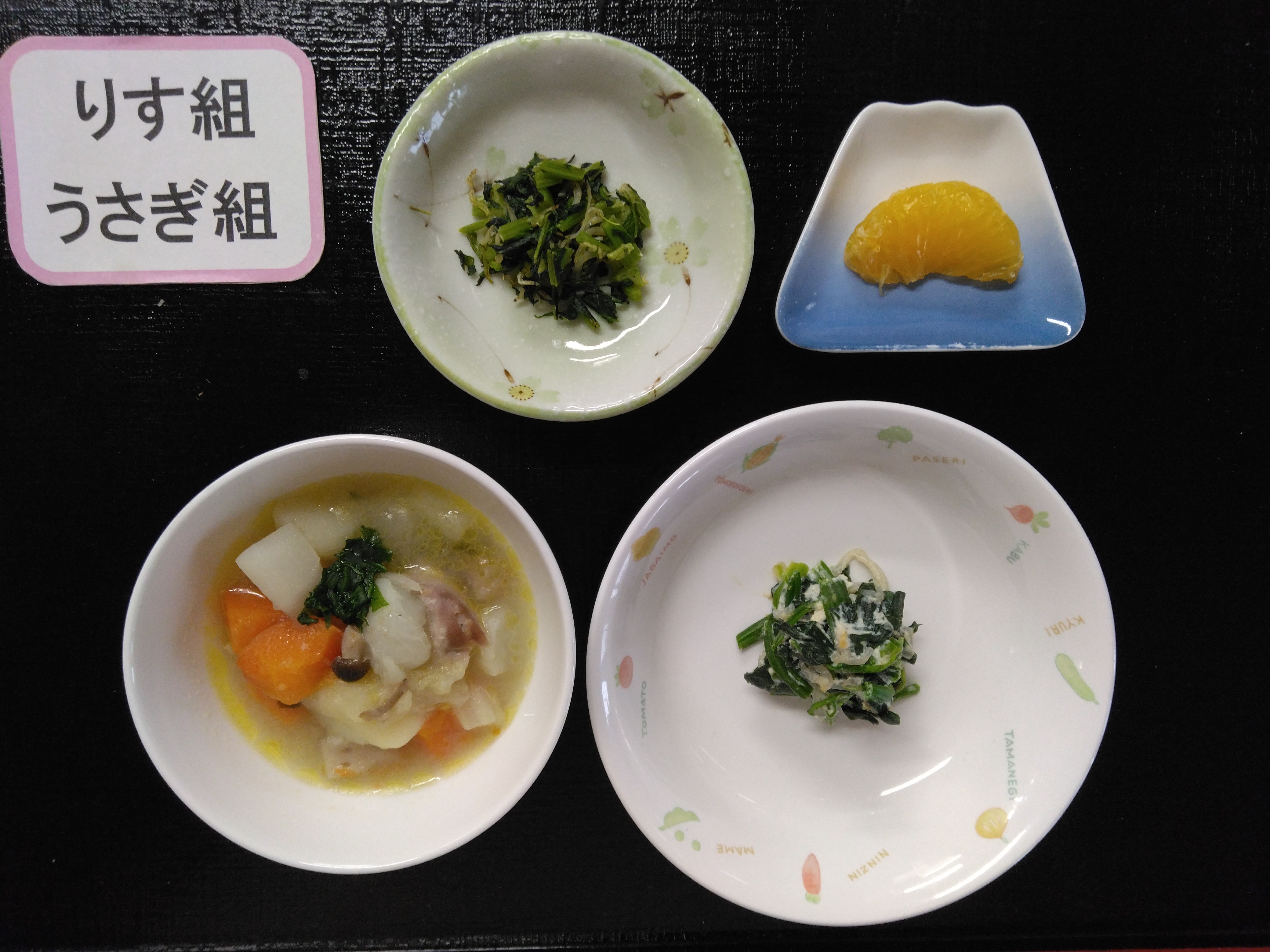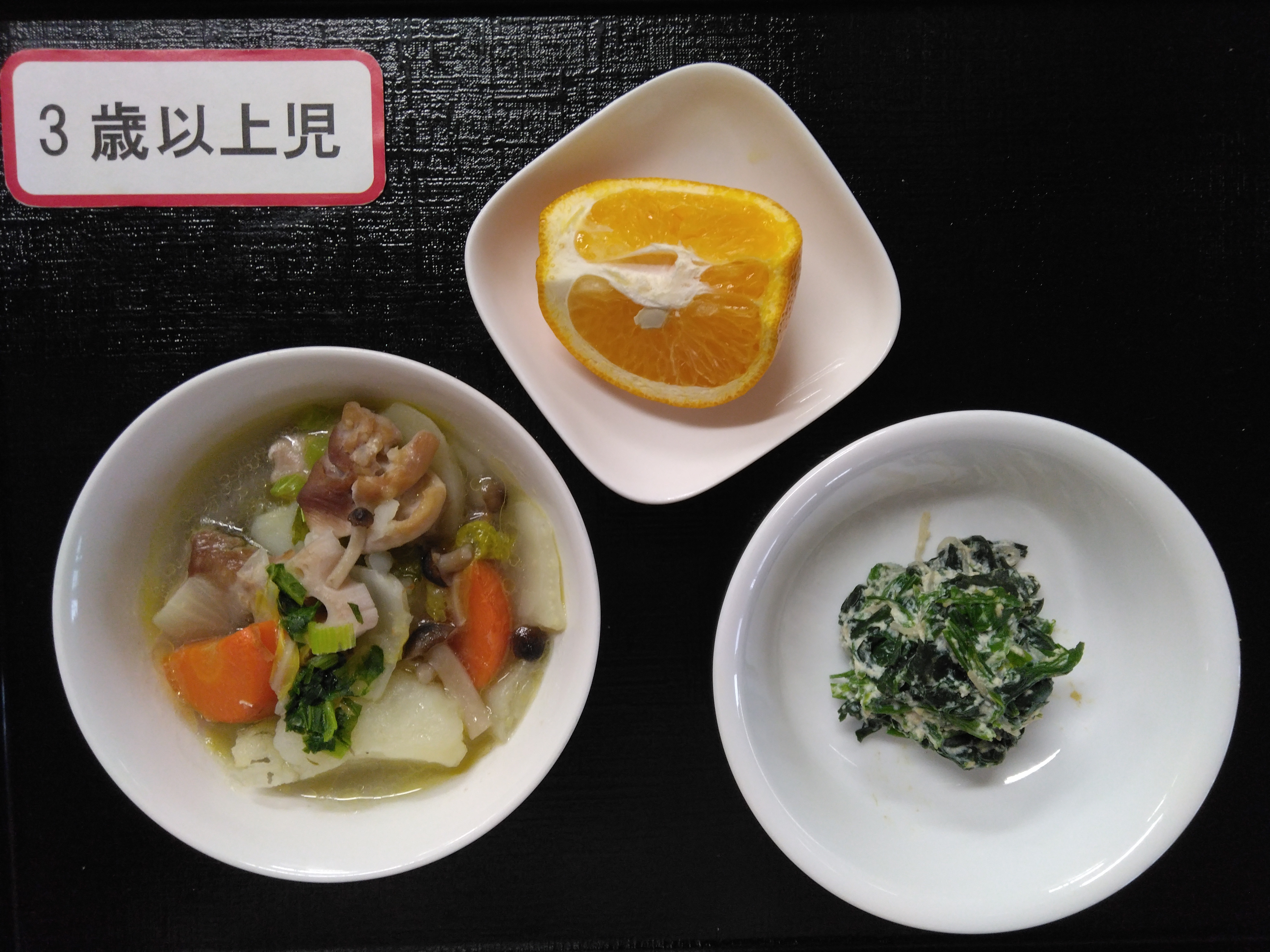 - 今日の和え物とお汁に入っている、オレンジ色の野菜が何か分かりますか? にんじん