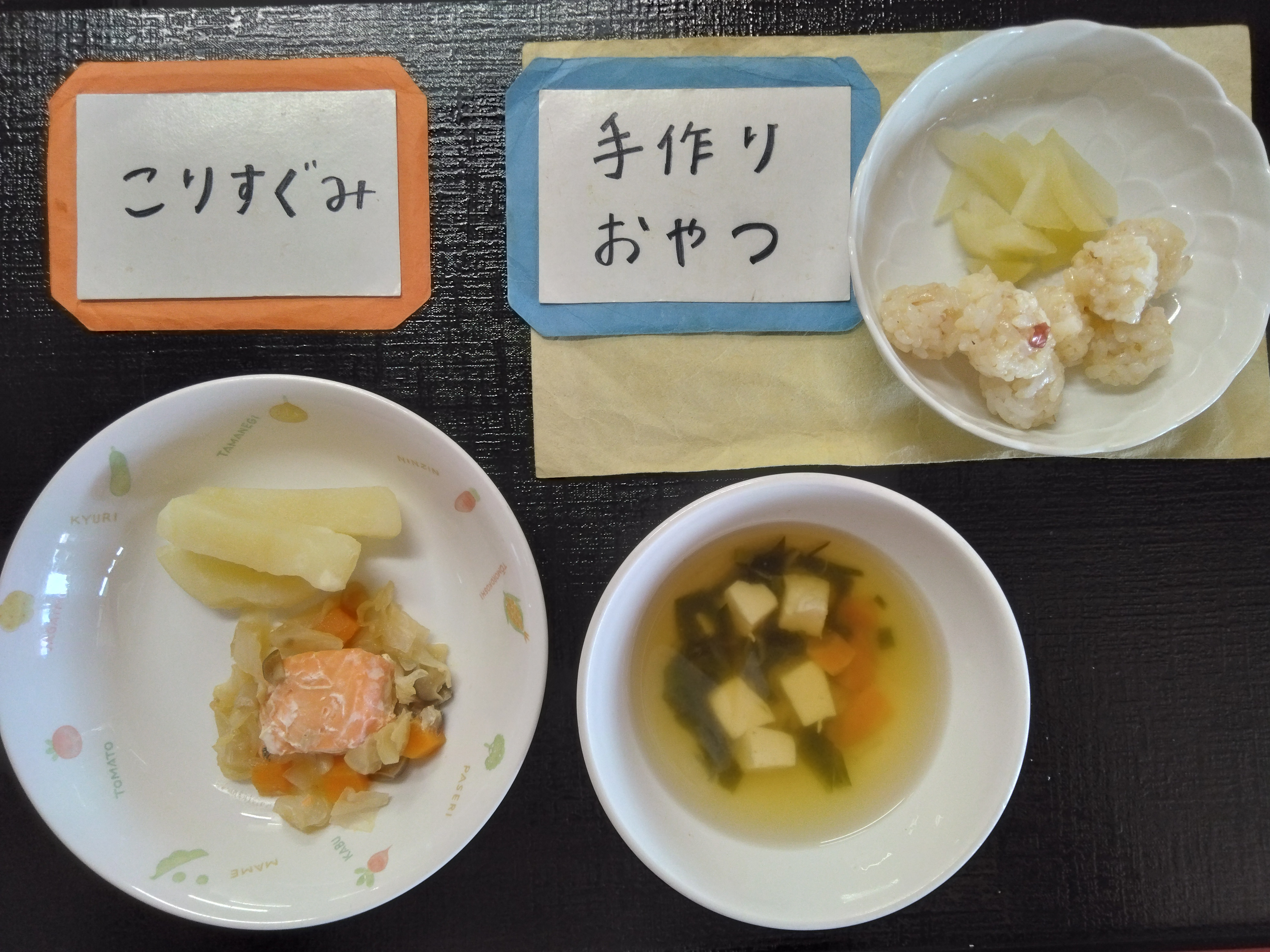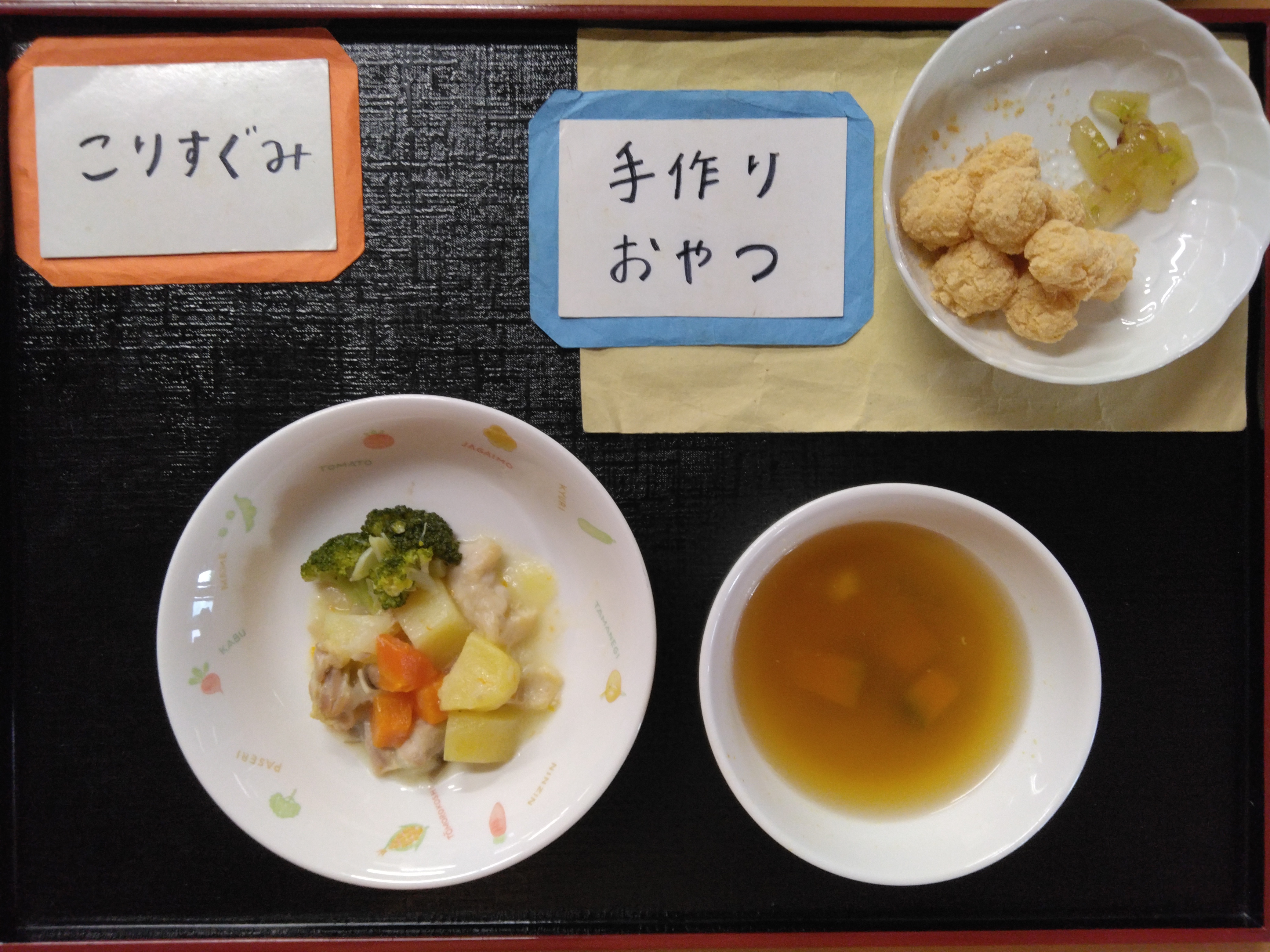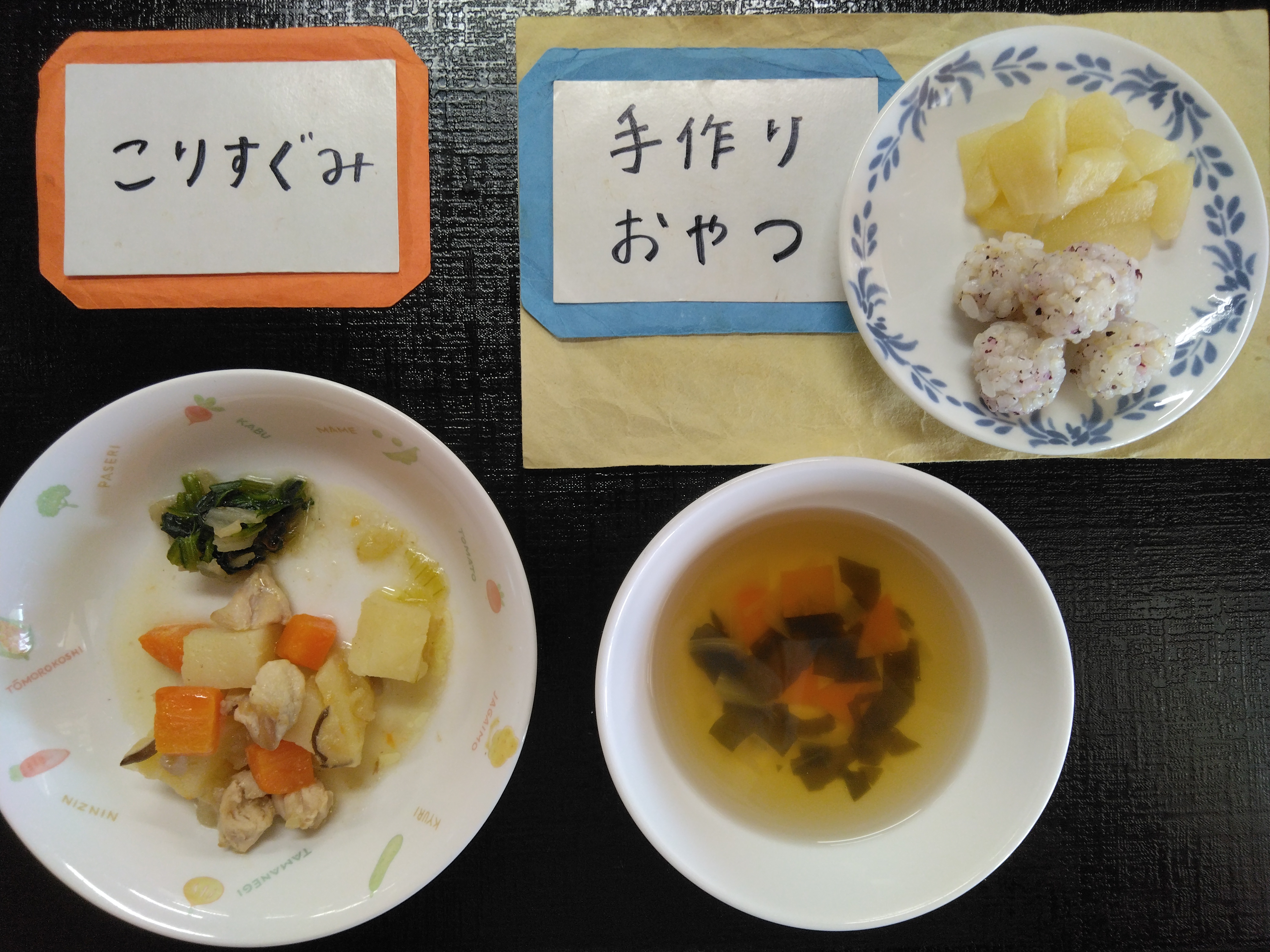 園では高野豆腐を油で揚げ、野菜や芋、きのこと一緒に煮込んでいます。