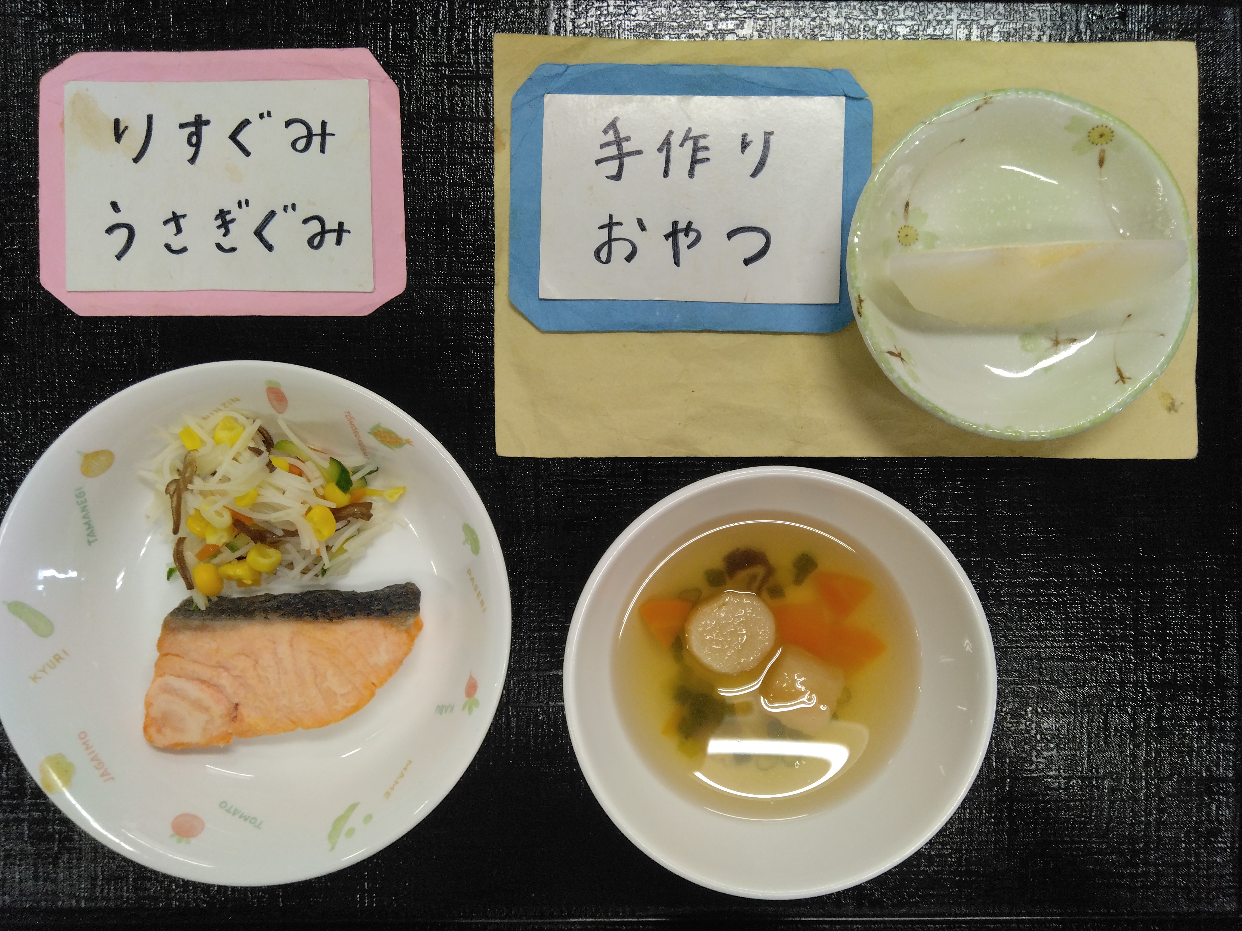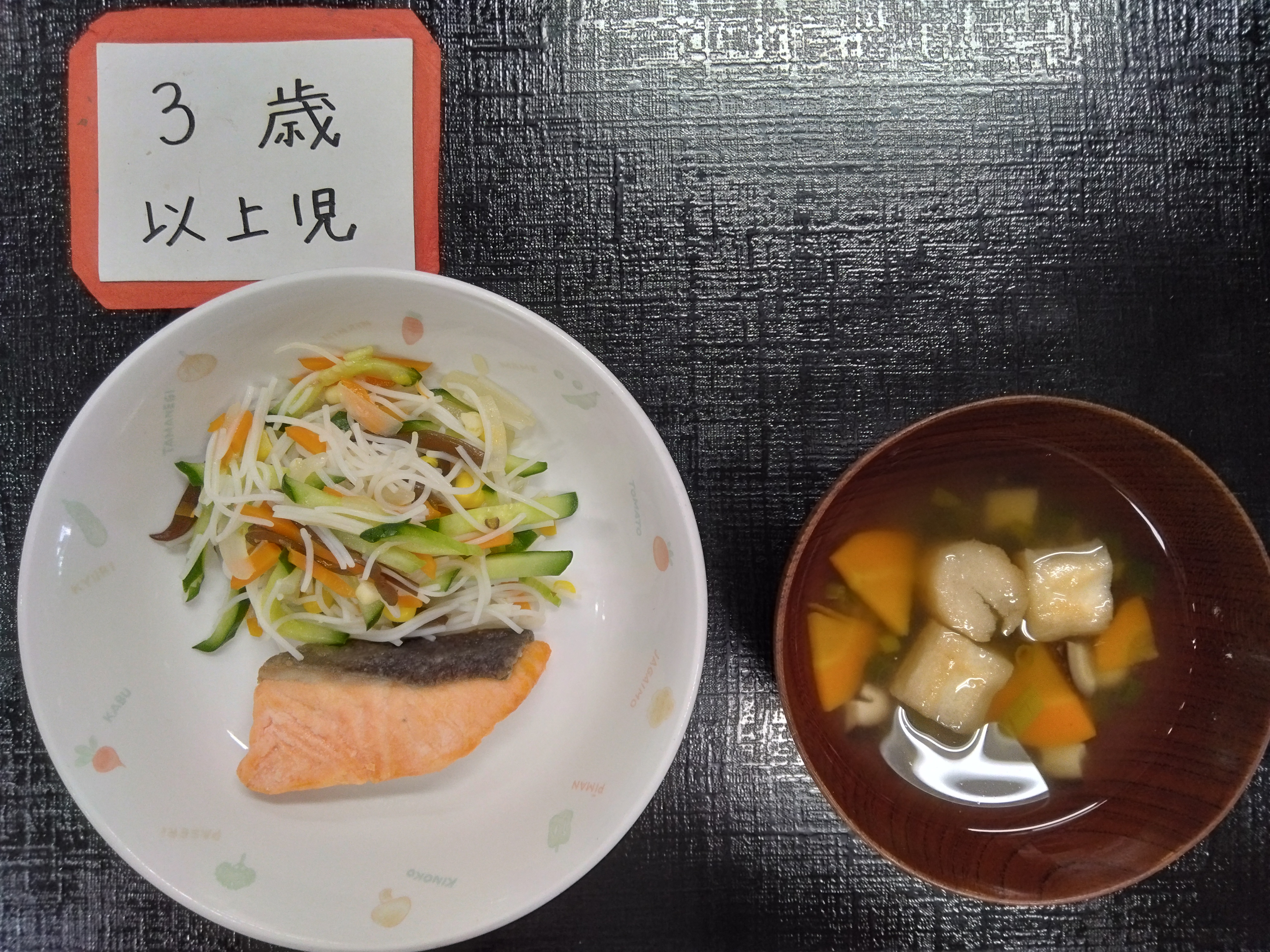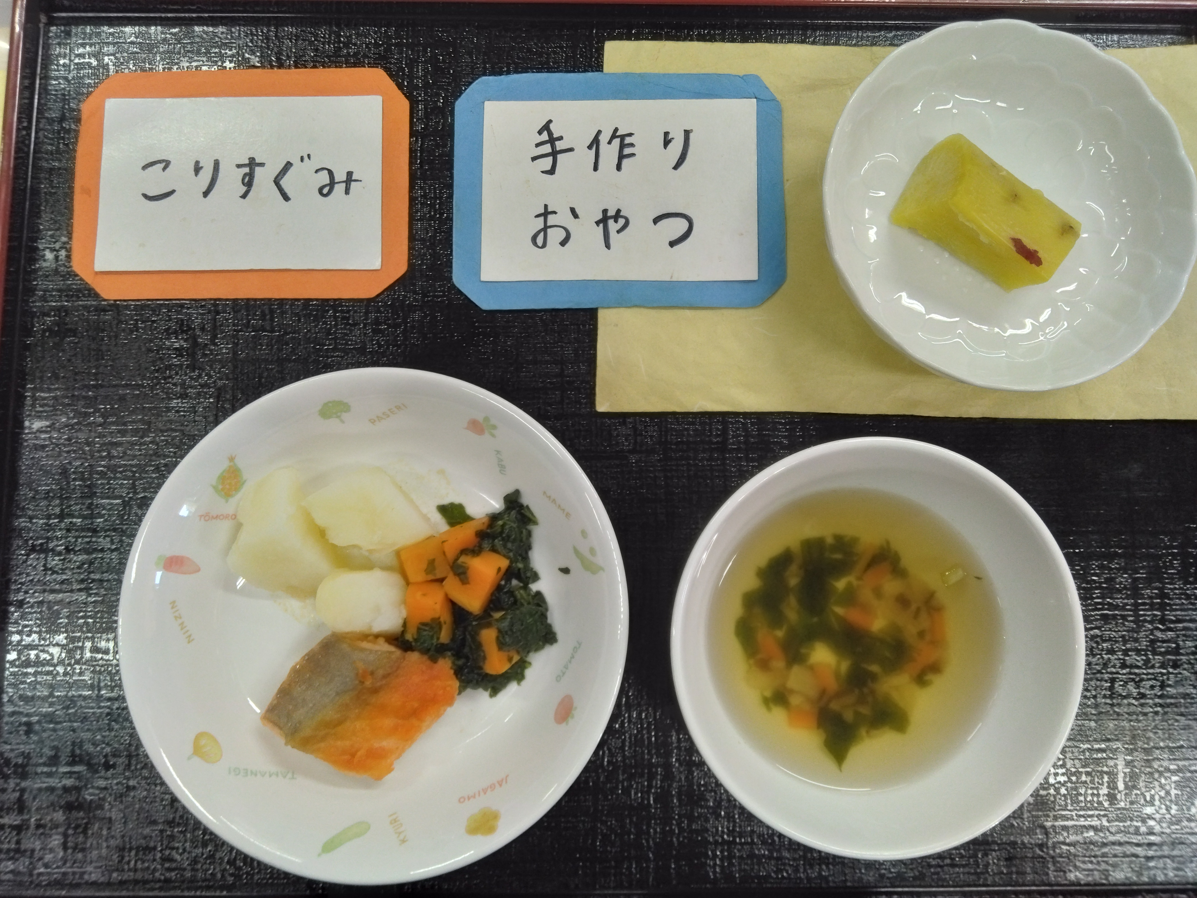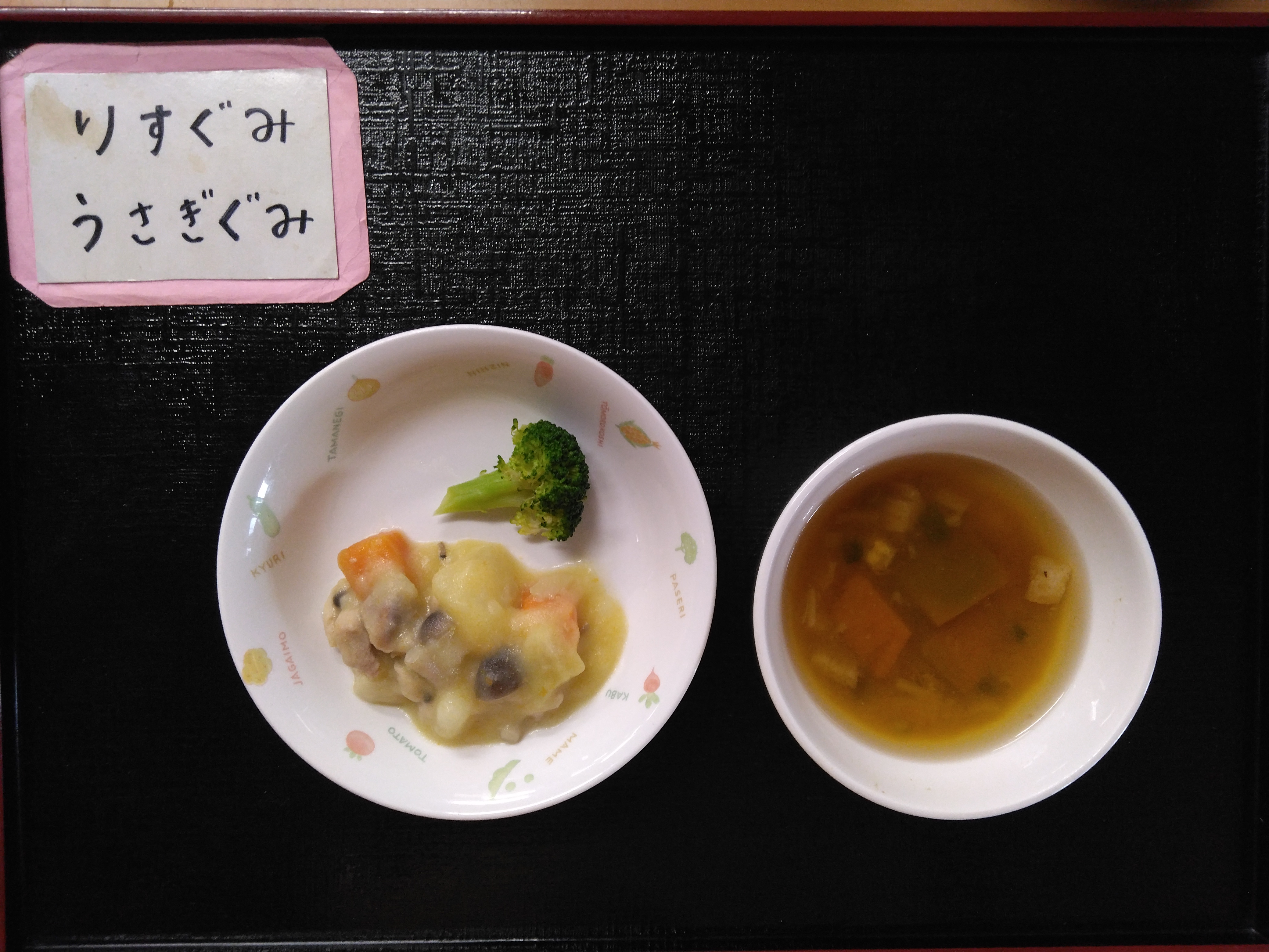 - 今日の給食には秋にいちばん美味しく食べられる食べ物が3つ入っています。
