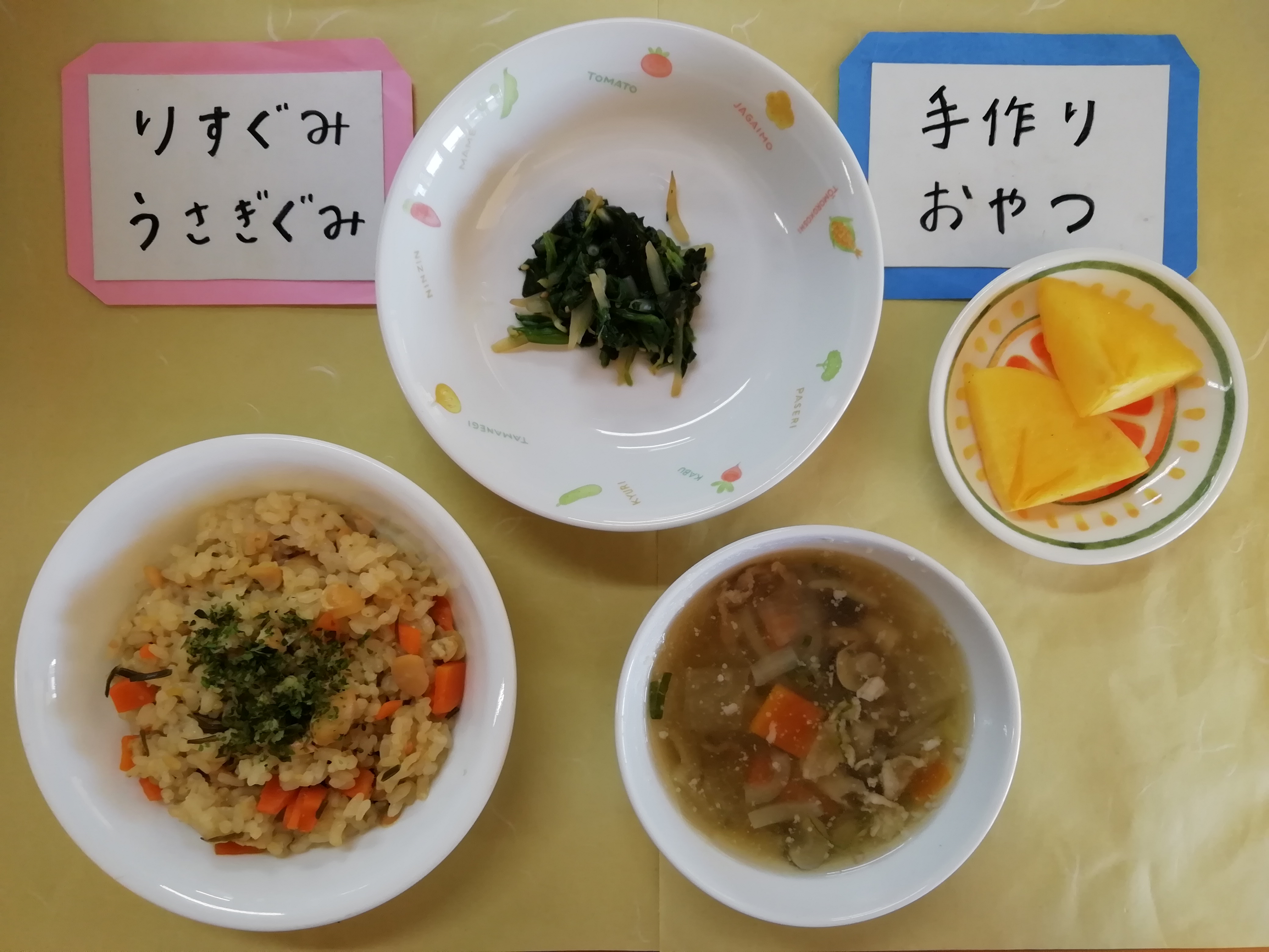 - 今日の手作りおやつはえんどう豆のおにぎりです。
