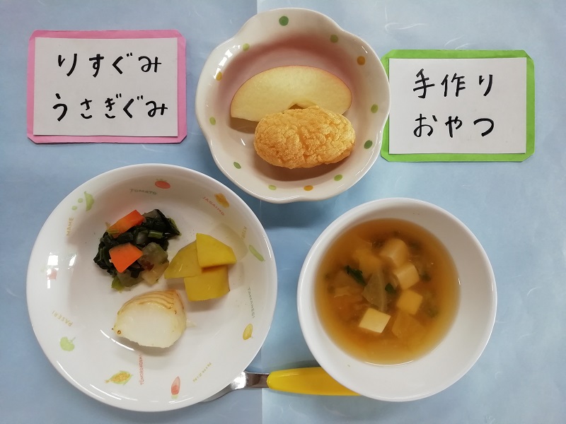 ※りす組さんはおやつにおにぎりと果物を食べました。