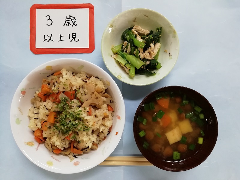 ※こりす組さんはおやつでおかゆ(おにぎり)と果物を食べました。