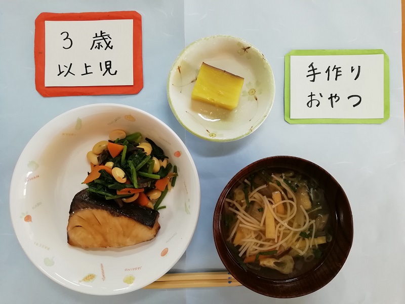 ※こりす組さんはおやつでおかゆと果物を食べました。