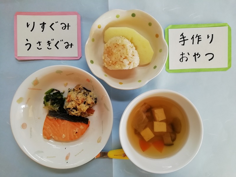 ※りす組さんはおやつでおにぎりと果物を食べました。