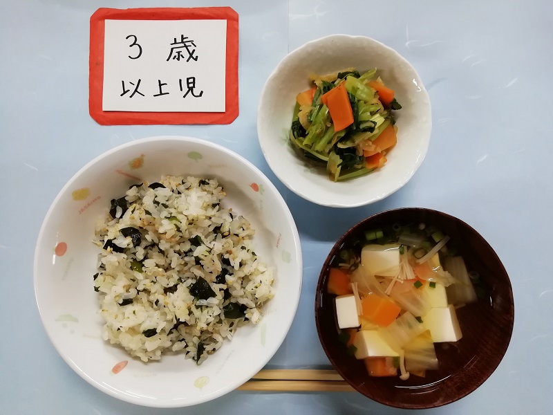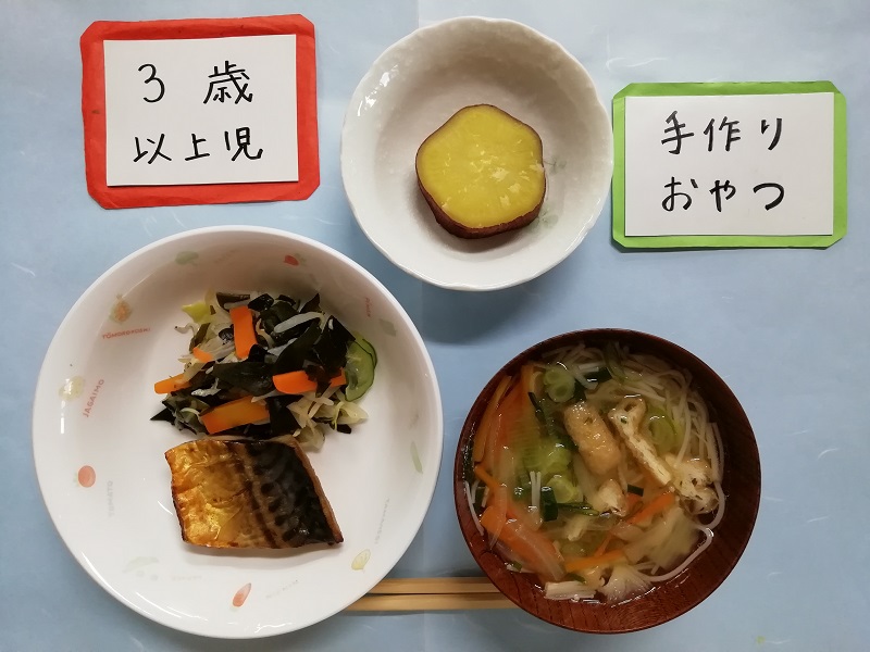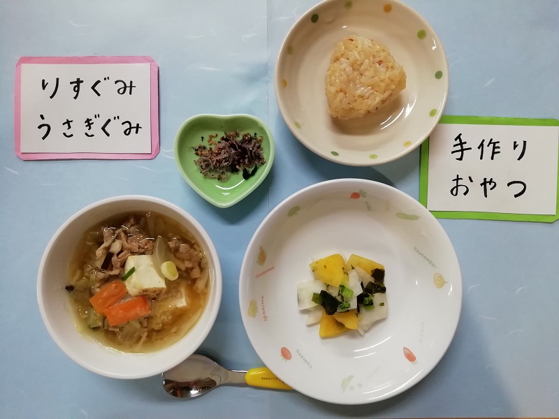 ※こりす組さんはおやつでおかゆと果物を食べました。